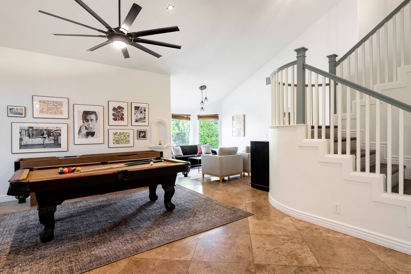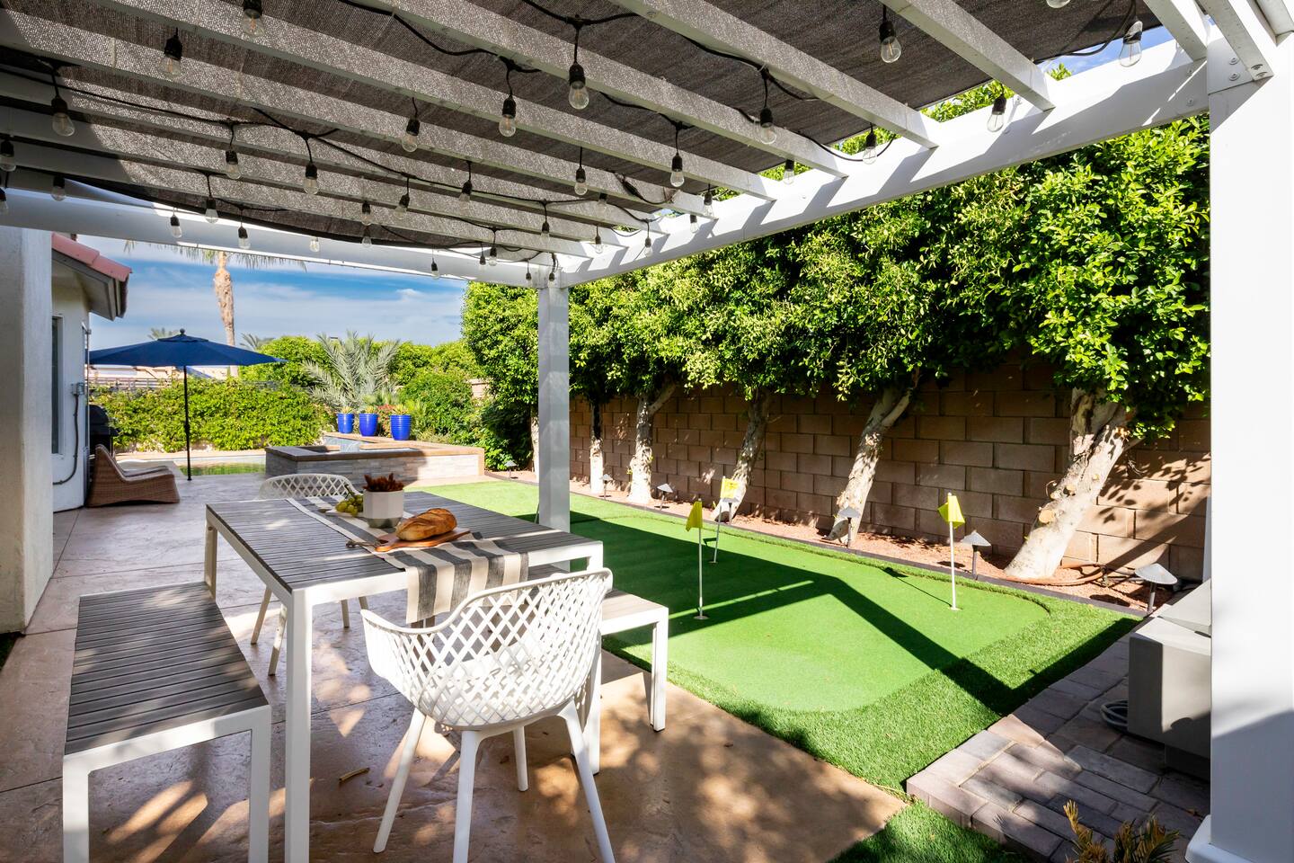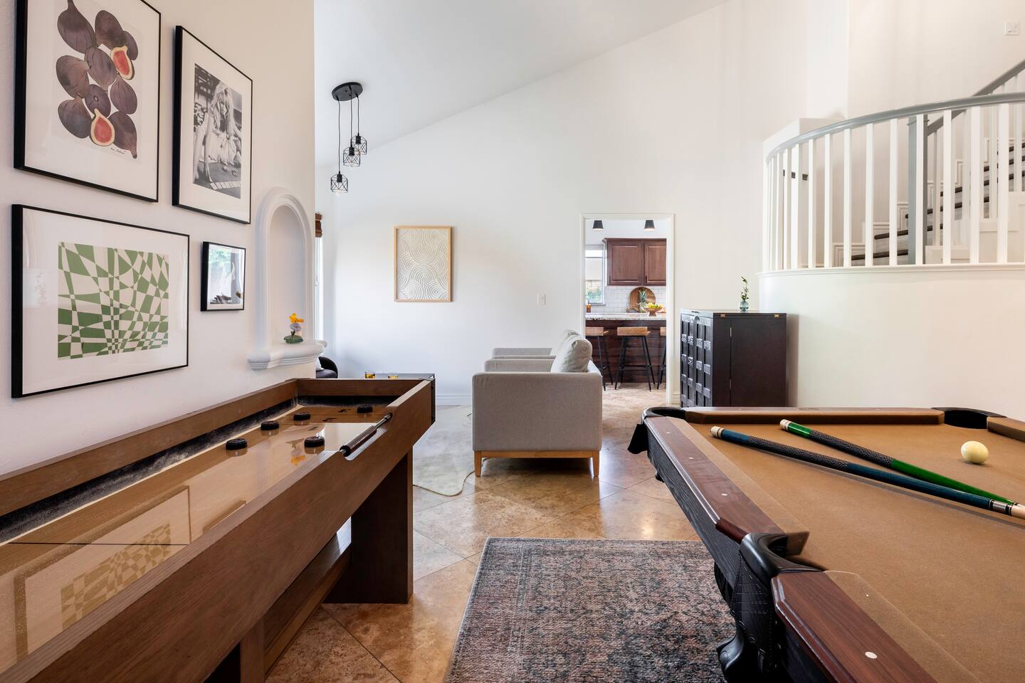 About This Space -Centrally located! A 10-minute drive from Empire Polo Club, Coachella & Stagecoach festival grounds, PGA West, Indian Wells Tennis Garden, Acrisure Arena and many other local event venues - Backyard paradise with a pool, hot tub, giant Connect 4, and mini putting course - Patio with a firepit lounge, al fresco dining area, and plenty of loungers - Sunny game room with billiards, shuffleboard, and a PAC-MAN arcade game - Open layout between the living room (includes a fireplace), dining area, and fully-equipped kitchen - Four comfortable bedrooms (3 with king beds & en-suite bathrooms, 1 room with a queen over queen bunk bed) Nestled in the heart of La Quinta, this stunning group vacation rental home offers a backyard paradise perfect for entertaining and relaxation. As you step outside, you'll be captivated by Casa Palmillo’s expansive outdoor oasis with a large pool and hot tub, perfect for cooling off during the day or soaking during the evenings. You'll also find plenty of loungers to catch some sun, including two resting on a sun shelf, so you can stay cool and comfortable while working on your perfect tan. The large patio includes an al fresco dining area under the pergola, where you can enjoy poolside meals and snacks. Practice your skills on the mini putting green, or gather around the firepit lounge, complete with comfortable outdoor couches, once the sun sets and the backyard transforms into a stunning nighttime escape with ambient lighting and sunsets. Inside, Casa Palmillo features an upscale and airy design with large windows that let in tons of natural light. The main living room includes comfortable seating, a TV, and a fireplace, while an open layout makes it easy to connect throughout the living, dining, and kitchen spaces. The large dining table near the kitchen offers seating for ten, perfect for family dinners or board games. And a fully-equipped kitchen with barstool seating at the large island, modern appliances, and everything you need to cook makes keeping everyone fed a breeze. The sunny game area off the living room offers a pool table, shuffleboard, and PAC-MAN arcade game perfect for kids and gamers of all ages. And with four comfortable bedrooms, three with king beds and ensuite bathrooms, and a fourth with a bunk bed perfect for accommodating children or groups of friends, ensures everyone has a place to relax and call their own at the end of the day. Located right across the street from Rancho La Quinta Golf Course, Casa Palmillo is perfect for golf enthusiasts and festival-goers. It's just a 10-minute drive from Empire Polo Club and the festival grounds, making it an ideal location for those looking to attend live events. You'll also find convenient and healthy grocery shopping options nearby, making it easy to stock up on everything you need for your stay. Located 100 miles east of Los Angeles, Coachella Valley is an oasis for those looking for an escape from the daily grind. Surrounded by picturesque vistas and mountains–as well as an abundance of golf courses, spas, and hiking trails–this desert destination is a must-visit. It's also the location for the nation's most famous music event, the Coachella Music & Arts Festival. No matter what time of year, there's always something exciting going on.